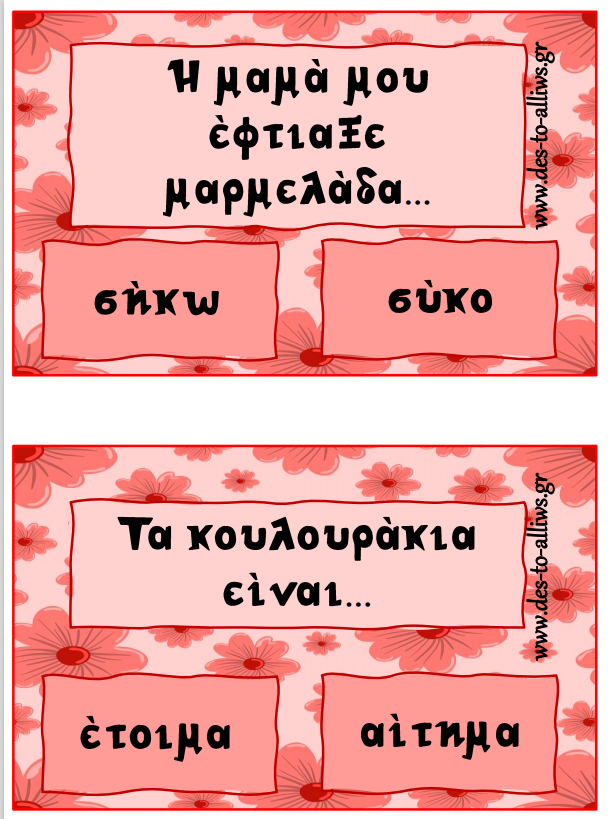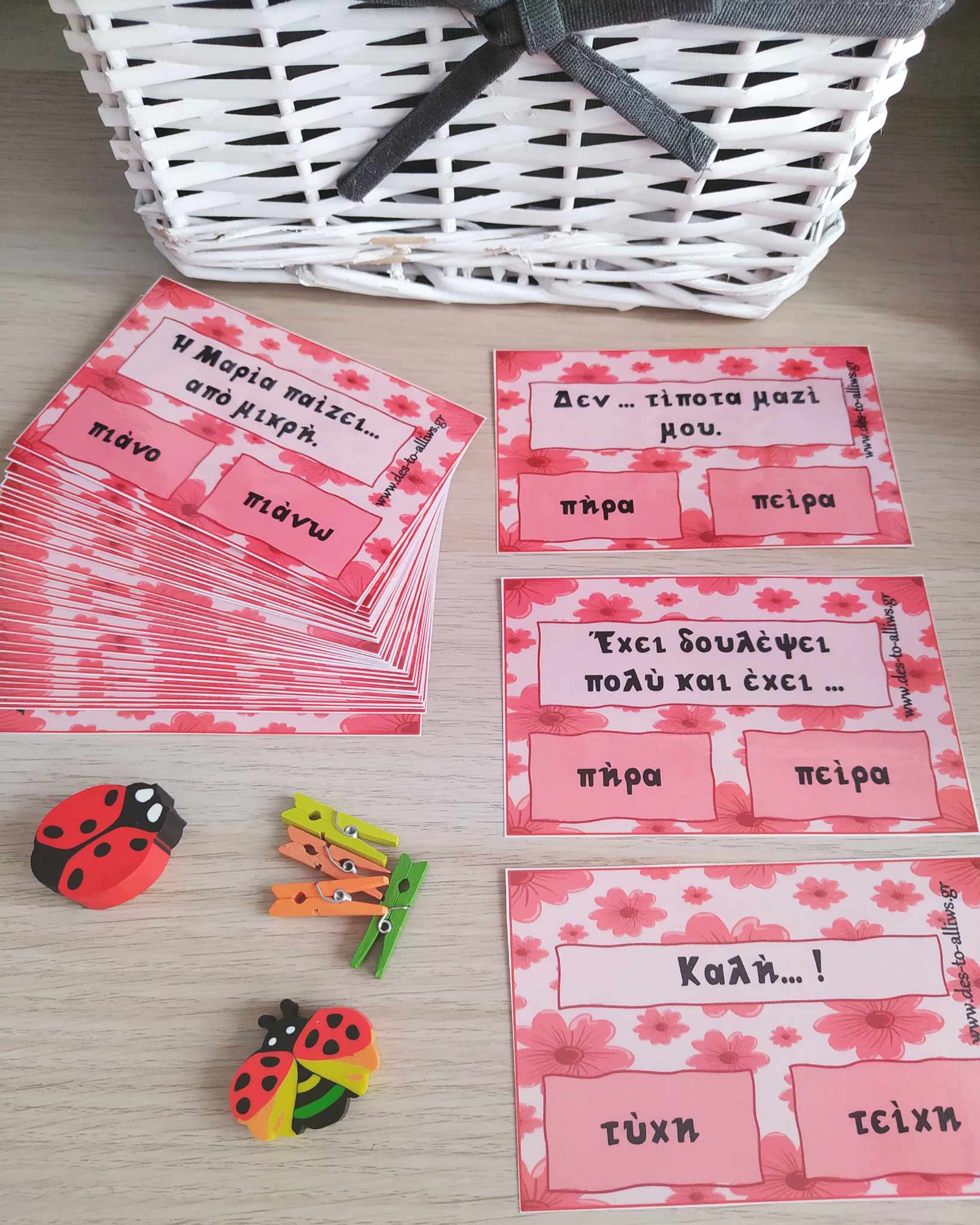 Συχνά στα ελληνικά συναντάμε λέξεις που ακούγονται το ίδιο όμως γράφονται διαφορετικά και έχουν διαφορετικές έννοιες. Μέσα από αυτό το παιχνίδι το παιδί εξασκείται στην διάκριση, στην ορθογραφία και την ερμηνεία τους.