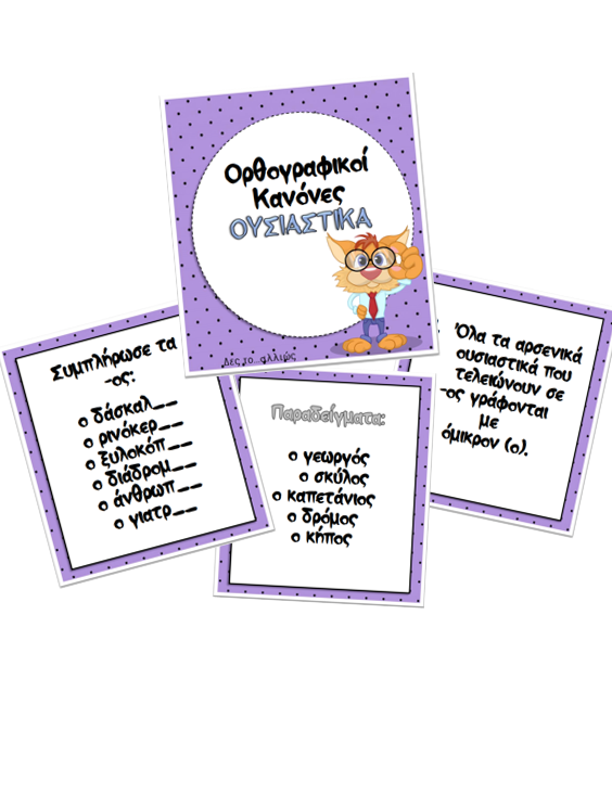 Το παρόν προϊόν αποτελεί ένα βιβλιαράκι 22 πλαστικοποιημένων καρτών διαστάσεων 10,5 x 11 εκ. με τους βασικούς κανόνες ορθογραφίας των ουσιαστικών , παραδείγματα και μία άσκηση για τον καθένα.