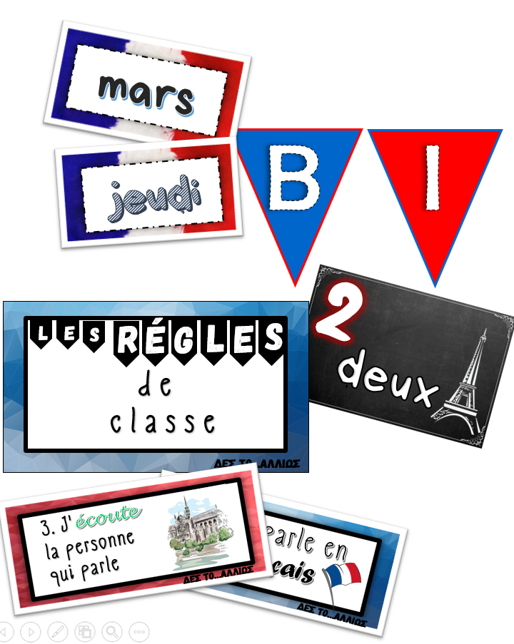 -5 πλαστικοποιημένες καρτέλες μεγέθους Α4 όπου αναγράφουν -η καθεμία- 2 σημαιάκια με τα γράμματα της λέξης “BIENVENUE”